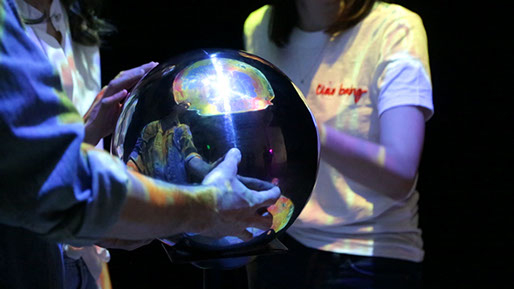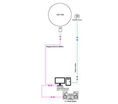 After multiple tests we went with a garden gazing ball as our main a single input for interaction for a couple reasons: In the first place, for any experience gardener the ball was a direct reference to a Garden: an organized system, constituted by multiple living and nonliving elements and that is created and maintained through constant processes of care and nurture. Secondly, the sphere became a central point of the piece were both the participants and the environment were reflected: when participants are caressing the sphere, they are not only “touching” the space, but they are also “touching” their reflections and those who are around the sphere, turning themselves part of the living system they are taking care of.