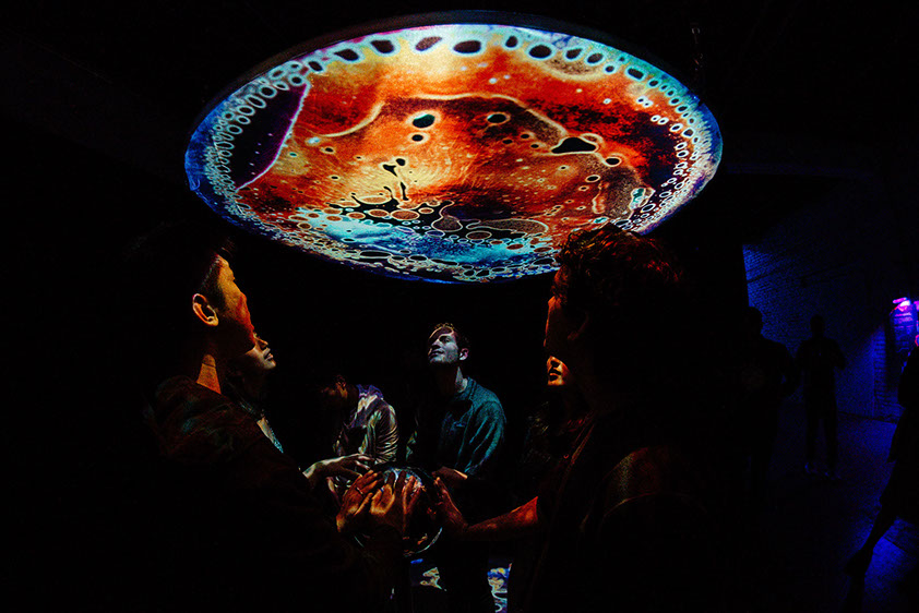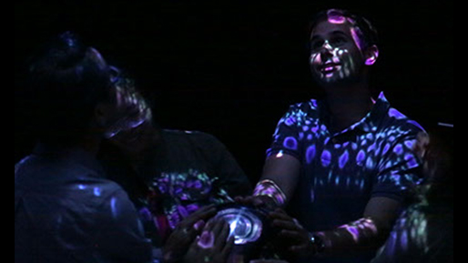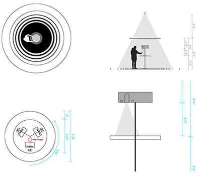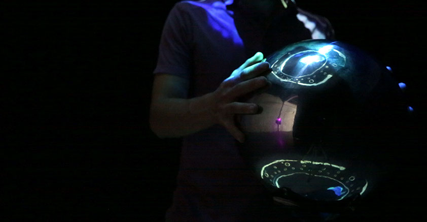 Changes in the interface meant logical changes in the whole installation. From the beginning the idea of a circular space where the participants meet in a circle to take care of the installation was present. I also had a very strong intuition regarding projection mapping over the participants in the space. However, when we moved from the 3 leap motions in a circular arrange to a single gazing ball in the middle, the projection mapping itself became a central element of the whole experience. We had found a way to simplify and focus our attention, now we needed to magnify the effects of each action on the space.