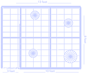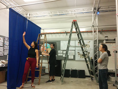 After writing the linear narrative and the possible interactions with the team, I designed the physical play area. The space was a 10' x 10' x 10' blue cloth cube that allowed us to control the light in the environment.
