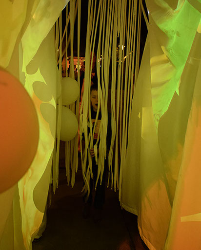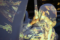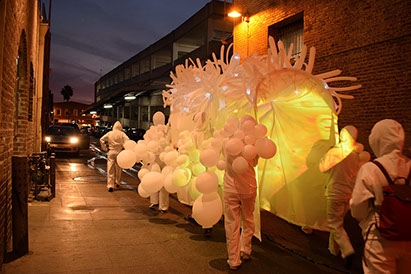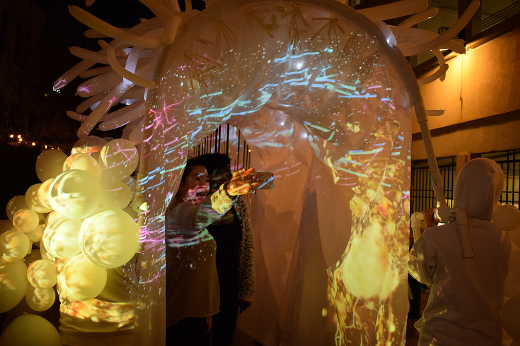 The Proto-Floto is a primordial protozoan blob that transports life beyond our universe. It is a flowing, cilia-covered, single-cellular organism that functions as a literal and metaphoric wormhole, burrowing a passageway and shortcut through the space-time continuum. The Proto-Floto is a fickle and “flam-buoyant” creature, with vibrant colors and imagery shifting on its outer “skin,” much like a chameleon. The microscopic organisms magnified on its surface were collected from Lower Arroyo Park in Pasadena.
