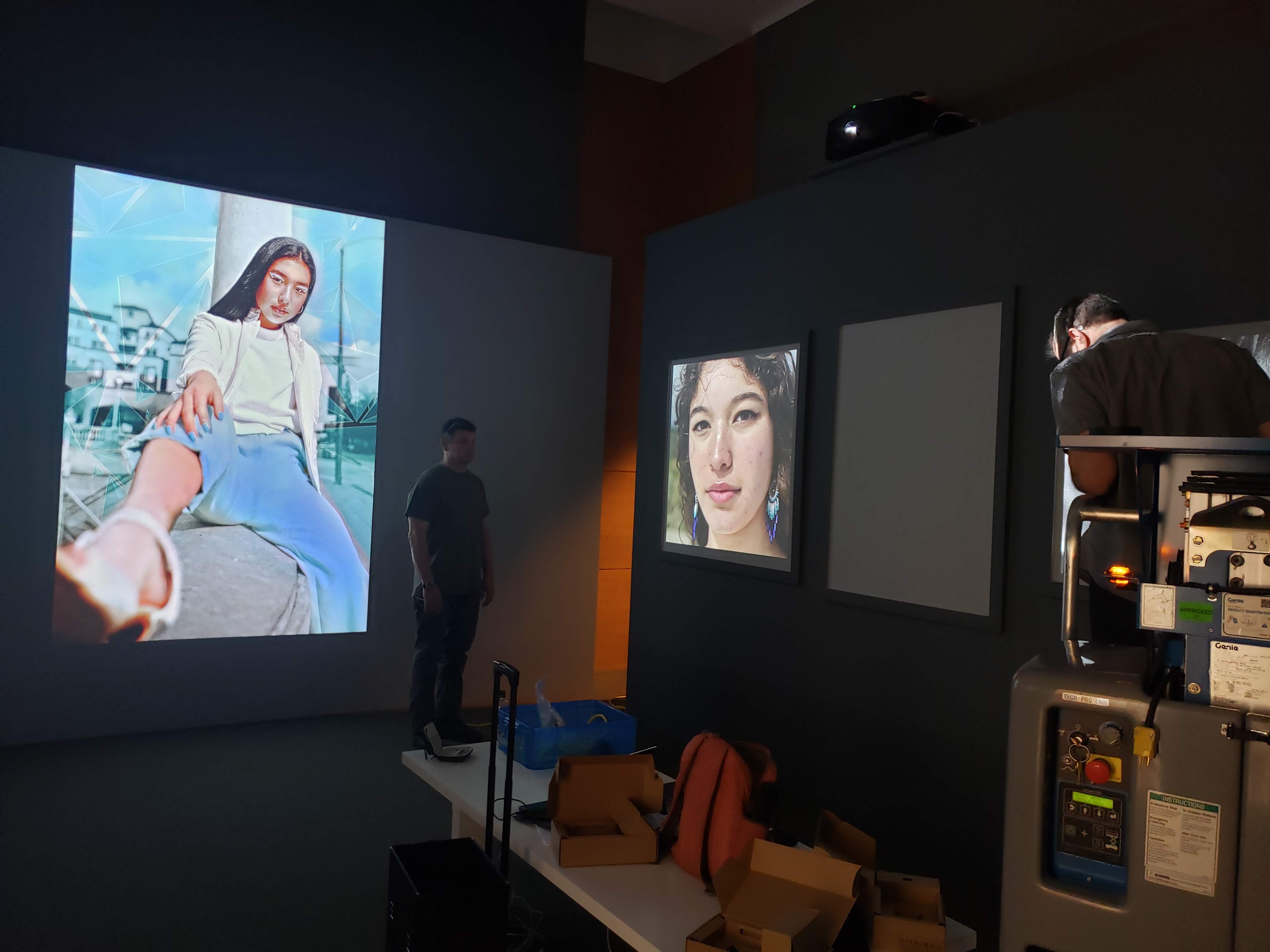 Additionally, to showcase even more work of the artists and the "selfie spots": videos designed to work as dynamic selfie backgrounds, there were Brighhtsign players across the whole center connected to smaller 6K projectors.