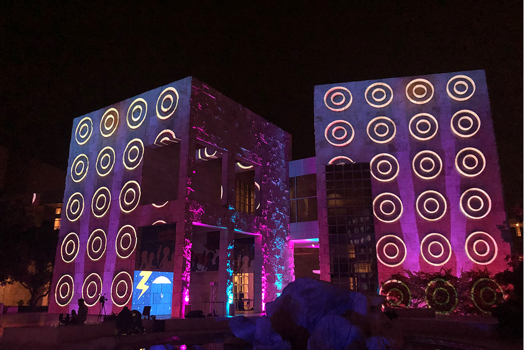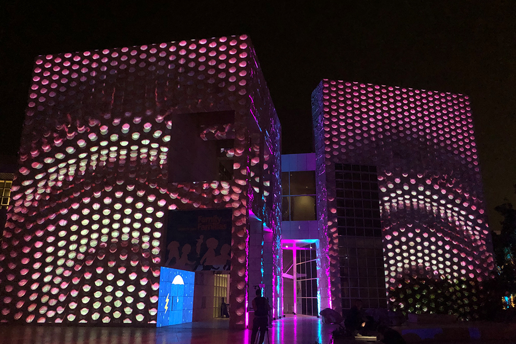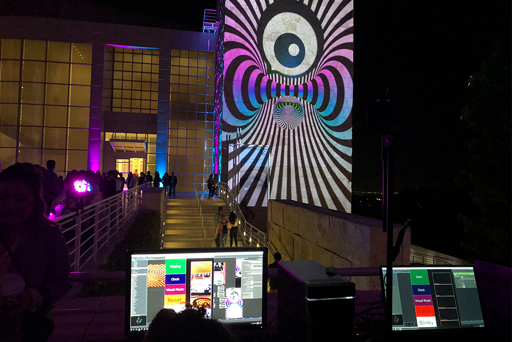 I was brought to the Getty Unshuttered Project to design and implement the projection mapping and file system playing a fully in Sync event across five main buildings. I also created dynamic and colorful 3D animations that could be projected projected on the rocks and buildings of the Getty center.